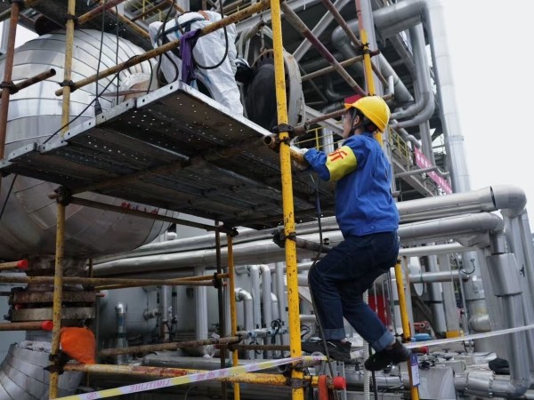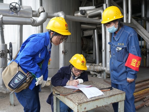 在彬州公司中修現(xiàn)場(chǎng),他們是嚴(yán)謹(jǐn)?shù)摹鞍踩l(wèi)士”。頭戴黃色安全帽,臂佩“分析”袖章,專(zhuān)注檢測(cè)設(shè)備,用儀器探尋隱患。無(wú)論是管道閥門(mén),還是罐體孔洞,每一處都細(xì)致排查。攀爬、蹲守,記錄數(shù)據(jù),他們以專(zhuān)業(yè)與認(rèn)真,守護(hù)生產(chǎn)安全,筑牢化工生產(chǎn)的“安全防線” 。